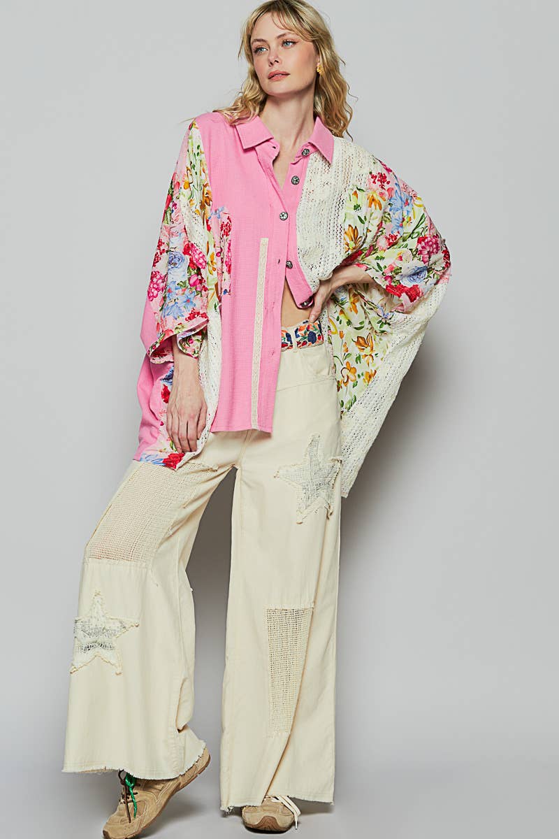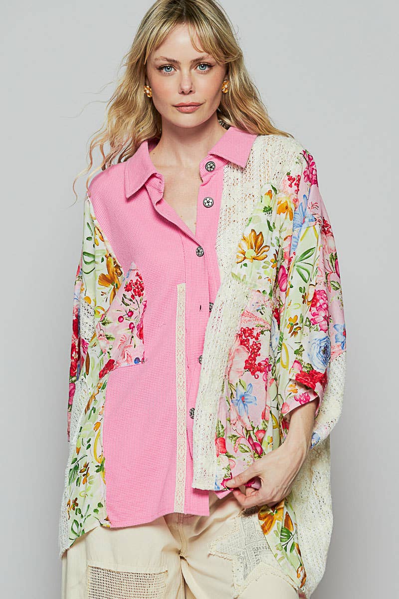 Designed in collar neck, oversized fit top in thermal and crochet lace mix with patch detail pointed floral pattern.
