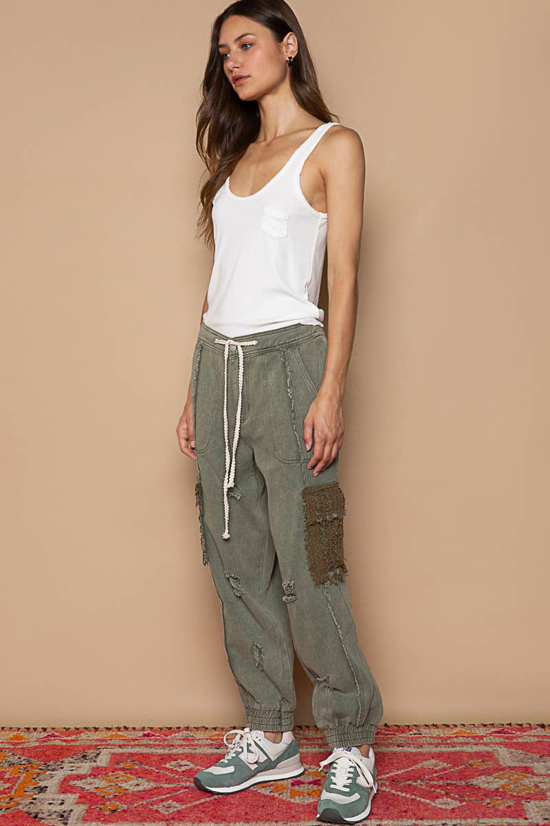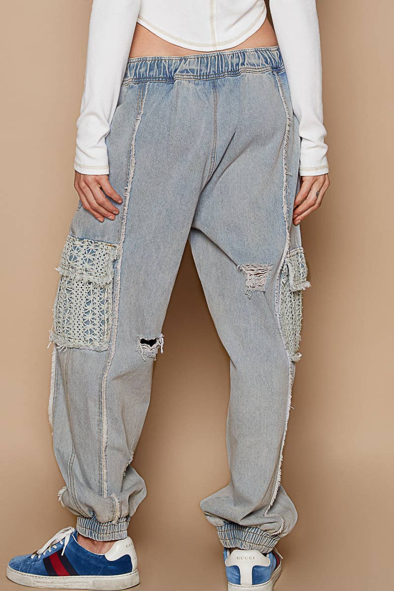 Designed in jogger denim pants with trim loop in waistband, side crochet lace pocket, and distress detailing.